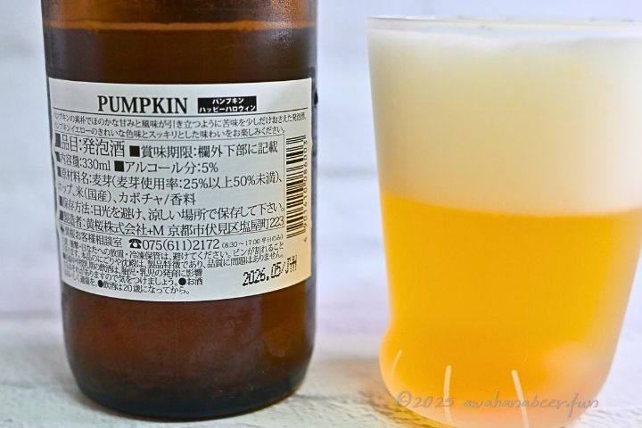 - 原材料:麦芽(麦芽使用率:25%以上50%未満)、ホップ、米、カボチャ/香料
